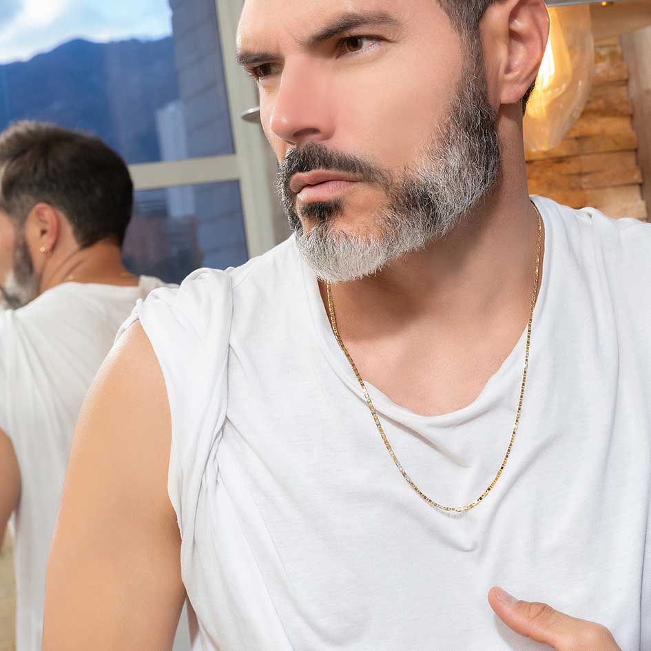 Cadena C Escalera Plana de 65 cm en oro laminado de 18K. Sus eslabones planos y alineados brindan un acabado sofisticado y brillante, ideal para lucir sola o realzar con un dije especial.✨