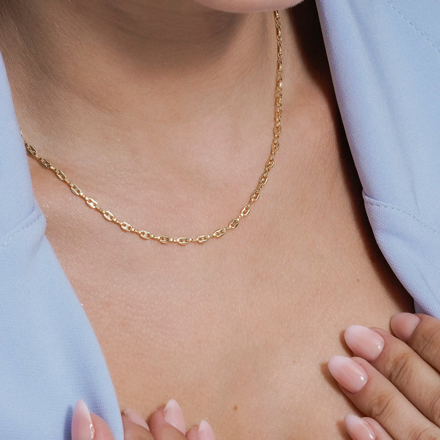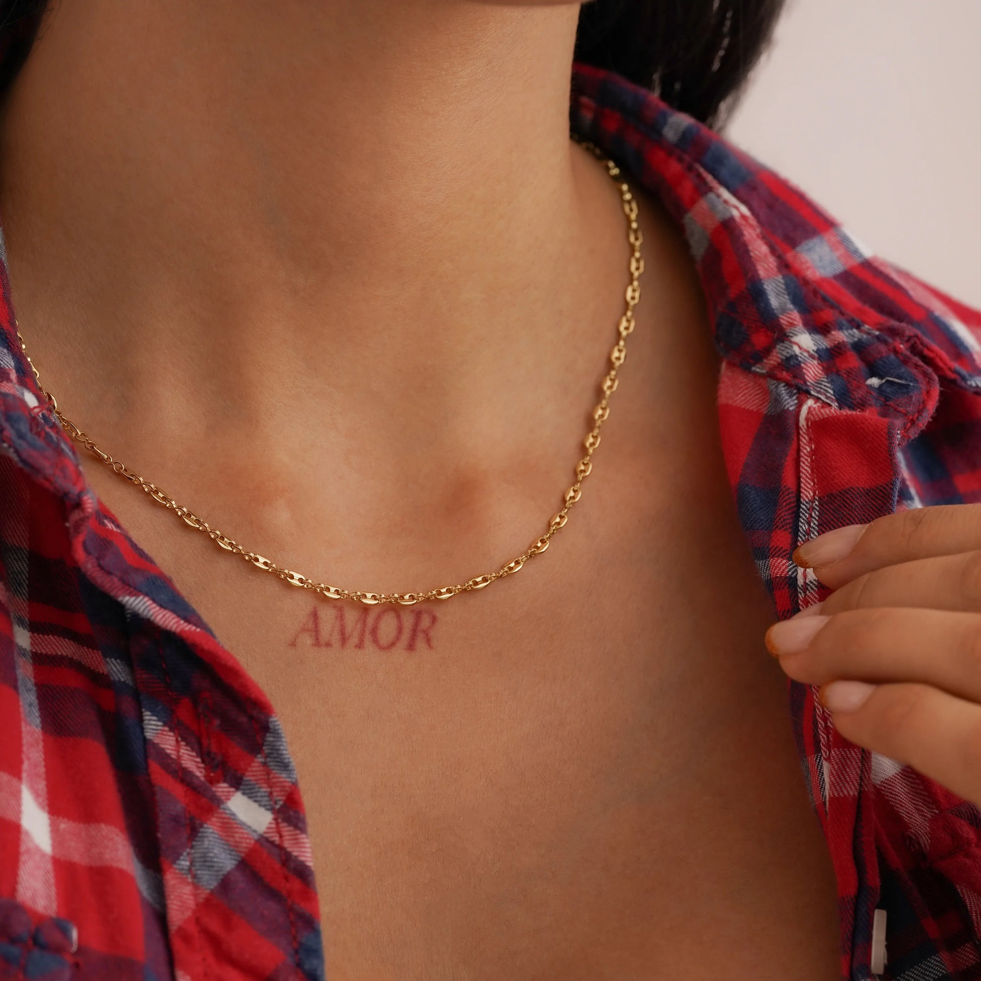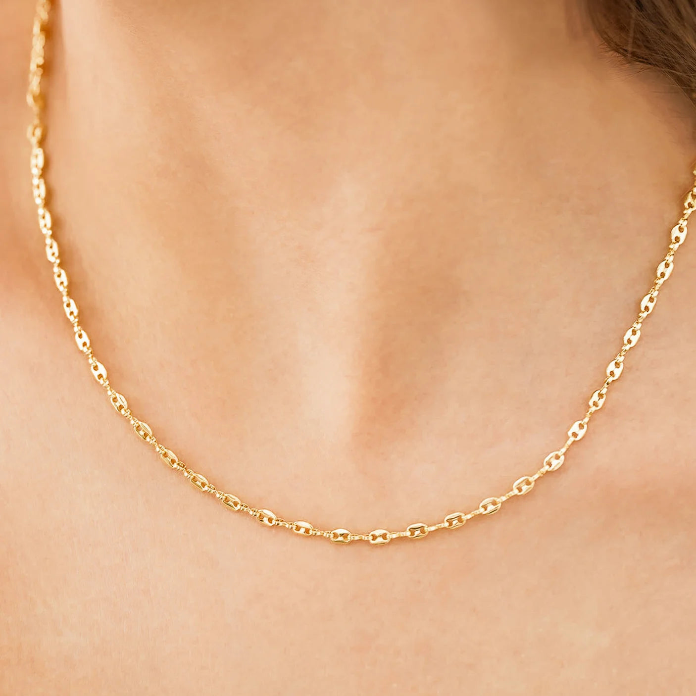La cadena C Gucci Delgada de 45 cm en oro laminado de 18K se distingue por su diseño clásico de eslabones ovalados y planos, que brindan ligereza y un brillo encantador. Una pieza versátil que luce delicada y femenina, ya sea usada sola o acompañada de dijes finos.✨